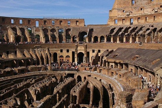 ![]() (レプブリカ広場) 九月廿六日(土)三時頃小便のために目覚めて後熟睡することを得ず、うとうとしをるうち七時頃夜が白み始めたり。日本の夜明と異なり一気に明るくならず、三十分ほどかけてやうやう明るくなるなり。一階のレストランにて朝食。パン、ミルク、ベーコン、スクランブルドエッグ、フルーツの類なり。 九時ホテルを辞す。英国大使館前より左手に伸びるチェルナイア通りを西に歩み大蔵省、ディオクレティアヌスの浴場跡を通り過ぎレプブリカ広場に至る。噴水を囲む円形の広場なり。囲繞せる建物はすこぶるクラシックな外観の石造建築物なり。広場北西の通りに面せる旅行会社JTBの現地エージェント事務所マイバスに立ち寄り昨日紛失せる財布につき相談をなすに、今日は土曜日にして空港事務所は閉鎖せられたれば明後日改めて連絡すべしと言はる。 ![]() (ローマ街角の朝市) その後旅行会社エージェントのガイドに付近を案内せらる。歩きながらローマの街についての基礎的な知識を教授せらる。通りの名前の読み方、地下鉄やらバスの乗り方、バルやらスーパーの利用の仕方などなり。たまたま朝市を見かけたれば爪切を一個買ひ求めたり。又栓抜を求めんとてガイドに栓抜をイタリア語にて如何言ふかと尋ぬるにアプリボッテリーアと言ふと答へたれば、売子の男に向ってアプリボッテリーアと言ひながら右手にて栓を抜く仕草をなす。売子の取り上げて示したるはアウトドア用の一体式キッチンセットなり。そを両手もて広げながらフォークの部分を示しクエスト・ペル・マンジャーレと言ひて物を食ふ仕草をなす、又スプーンの部分を示しクエスト・ペル・ベーレと言ひてスープを飲む仕草をなす。最後に栓抜の部分を示しクエスト・エ・アプリボッテリーアと言ひながら栓を抜く仕草をなす。しかしてプレーゴ、プレーゴ、プレーゴと言ふ。値を聞くに五エウロと言ふなれば、余是非もなく買ひ求めたり。 ![]() (サンタ・マリア・マジョーレ教会) 朝市のある小さな通りを抜け出るに巨大な寺院建築物を目にす。サンタ・マリア・マジョーレ教会と言ひ昨夜空港よりホテルに向ふ徒次見かけたるものなり。羅馬法王庁直轄の教会なる由。荘厳なる趣をただよはせてあり。 教会付近にて解散し、テルミニ駅に向って歩み、駅前のチンクエチェント広場より地下鉄に乗る。深度の甚だしきに驚く。ローマは至るところ遺跡あれば、それらを破壊せざるように地下鉄を掘るには深度を甚だしくせざるべからずと言ふ。それでもなほ地下鉄工事にともなひて多くの遺跡を破壊せることはフェリーニの映画ローマにあるとほりなり。 ![]() (コロッセオの外観) コロッセオ駅にて下車。駅を出れば目前にコロッセオの建物あり。入口に長蛇の列何重にもわたって続きゐたり。そのうちの一は個人予約済客向け、一は団体客向け、一は一般客向けなり。余らは一般客向けの列に並びしところ、どういふわけか、他の列よりもはるかに早く入場することを得たり。殆どの客事前に予約せるがためと思はれたり。 コロッセオは紀元一世紀に円形競技場として建てられたる由。剣士同士戦ふほか猛獣と奴隷を戦はしむることを以て悪名を馳せたるなり。コロッセオとは肖像と言ふ意味なり。傍らにネロの巨大なる像の立てることに由来すと言ふ。正式名称はフラティウス円形競技場(Amphitheatrum Flavium)と言ふ由なり。 ![]() (コロッセオ内部) 場内に入る、頗る奇観なり。中央のアリーナ部分は礎石むき出してあり、また側壁は一部破損してあり、それにつけても壮大なり。長径188米、短径156米、外周壁の高さ49米の規模を誇る由なり。五万人の観客を収容し、皇帝臨座のもと中央アリーナ上にて様々な競技行はれたるなり。そのアリーナの床今は存在せず、地下の構築物露出してあり。 |