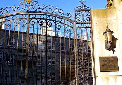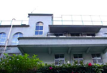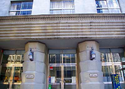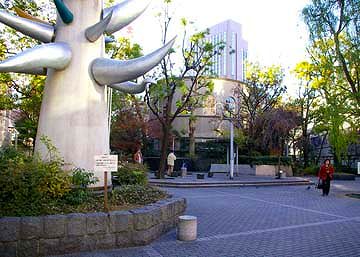 震災復興小学校の多くに見られるものとして、連続した半円形の窓があげられます 校舎建築はとかく単調なものになりがちなものを、こうした細部の工夫で補っているようです また、復興小学校には、隣接地に小公園を併設しているものが多く、 その数52にのぼります 泰明小学校にもそのような公園が併設され、今では数寄屋橋公園として 市民の憩いの場所になっています。 公園の向こうに見えるのは体育館 手前の像は岡本太郎の手になる彫刻です なお、この学校は島崎藤村や北村透谷が卒業したことで知られています |