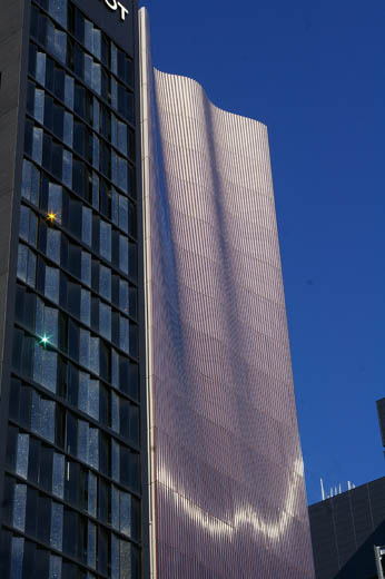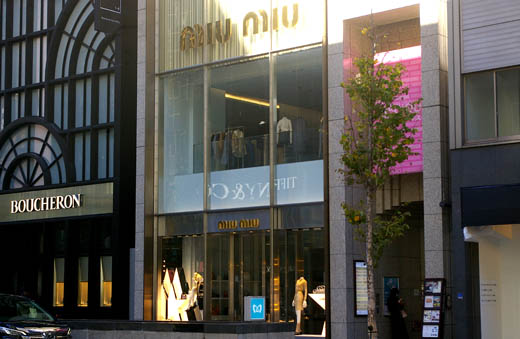 シャネルから北方向へ数歩戻ると、細長いペンシル・ビルのような外観の建物が立っています。銀座トレシャスという名称の複合ビルです。もともとは越後屋という名称でしたが、改築を契機に洋風の名前にかえたそうです。設計は大成建設で、2010年に竣工しました。 上の写真は、正面から眺めたもの。この角度からだと、ペンシル・ビルに見えます。一階フロアには、イタリアのラグジュアリー・ブランド、ミウミウが入っています。 これは、斜め手前から眺め揚げたもの。この角度からだと、ただのペンシル・ビルではなく、奥のほうが膨らんでいることがわかります。 これは、ミウミウのショーウィンドウ。複合ビルですので、ショーウィンドウの隣に階段スペースの入り口が開いています。 (ロロ・ピアーナ) シャネルより南へ数歩先に、これは本物のペンシル・ビルが立っています。イタリアの生地ブランド、ロロ・ピアーナの旗艦店です。設計は青木淳。竣工は2020年です。 ロロ・ピアーノらしく、カシミアの生地をイメージさせるようなファサードを採用したそうです。なるほど、そんなふうに見えないでもありません。窓がなく、まるで服地のようにふんわりした印象です。 これは、店舗のエントランス部分。この近さだと、外壁がステンレスで作られている様子がよくわかります。 |