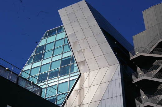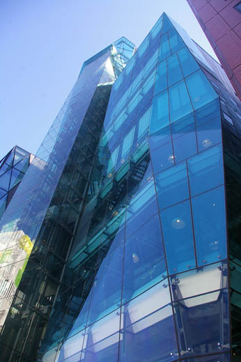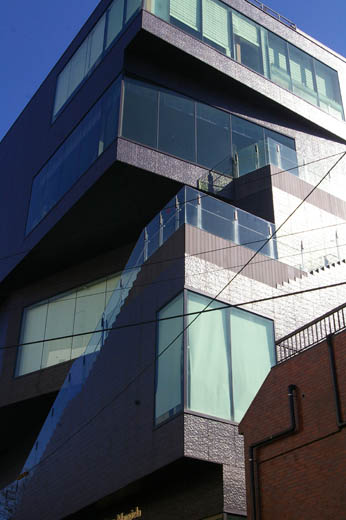 ![]() 表参道の一郭に神宮前小学校があり、その斜め前に奇妙な形をした建物がたっています。GYRE(ジャイルと読みます)といって、複合商業施設です。ちょっと見た目にも、かなり風変わりな印象をうけます。建物の各階が、それぞれずれているように見えるのです。各階が連続していないで、断絶したものを積みあげたように見えるところから、まるで積み木のイメージそのものです。 設計はオランダを拠点とする建築家集団MVRDV。設計思想は、 SWIRLといって、回転性を持たせるというものです。具体的に言うと、従来箱型の中に整形的に埋め込まれていた各階の独立性を高めたうえに、それぞれの階に回転性を持たせることにより、流動的な雰囲気を出そうということだそうです。竣工は2007年です。 上の写真は、やや斜め角度から見上げたもの。この角度からも、各階がそれぞれ独立性を保ちながら、回転を利かせて積み上げたように見えます。 ![]() これは正面から見上げたもの。とても統一体とは見えませんね。 ![]() これは、横手から見たもの。各階の接線がそれぞれずれて見えます。 ![]() (The Iceberg) 表参道と明治通りの交差点から、明治通りを渋谷方面に向かって300メートルほど歩いたところに、全面ガラス張りの奇妙な形の建物がたっています。The Icebergという名の複合商業施設です。香港の不動産会社ヴェロックスが2006年に竣工させた建物です。設計はCDI青山スタジオ。設計思想は都市のクリスタル。クリスタルのように光り輝く氷山をイメージしたといいます。 上の写真は、やや斜め角度から見上げたもの。全面を覆うガラスは、一つ一つが異なった形状をしています。 ![]() これは、正面のエレベータ・スペースに注目したもの。 ![]() これは、背面を眺め上げたもの。裏手の路地から見える眺めです。 |