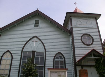 建物の特徴は、尖塔をいただいたゴシック様式の外観と 壁に貼られた下見板です この下見板は、イギリス式のもので、 横板の下端を下の板に重ねてはっていく工法をとっています これとは別に、横板を単純に並べる工法は、ドイツ式下見板と呼ばれます |