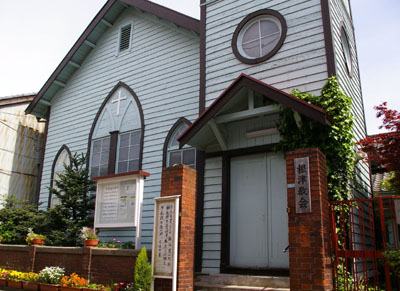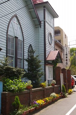 根津教会所在地: 文京区根津1−19建築年: 大正8年(1919) 構 造: 木造平屋 特 徴: イギリス式下見板張の本体の 上にゴシック風の尖塔を戴く洋 風木造建築物 |