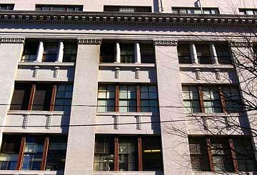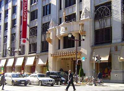 三越百貨店本店は当初大正3年(1914)に建設されました。建物の外観は列柱などの派手な装飾で人の目を驚かし、日本で最初のエスカレーターを設置するなど、日本で最初の本格的洋風百貨店でした。名称が徳川時代以来の越後屋呉服店から三越と変わったのもその頃のことです。 関東大震災では火災にあい、大きなダメージを蒙ったため、昭和2年に大改修を行いました。その折に、外観にも大きな変化が生じています。昭和12年に増改築を行い、ほぼ今日の姿になりました。 外観は均整のとれたネオルネサンス様式です。内部空間は5階吹き抜けの大ホールを中心に、一面に大理石が敷き詰められ、装飾性に富んだ意匠です。 三越は、日本の百貨店建築の勇とも言える存在です。 |