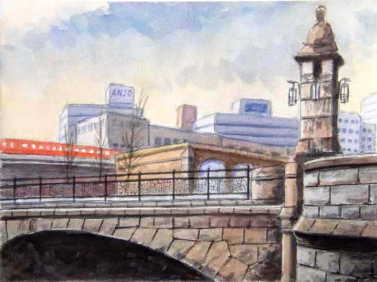 この絵は電気街のある一画から交通博物館のある方向をにらみながら描いたものである。ごらんのように、親柱はクラシックなデザインであるし欄干にも凝った彫刻が施されている。この橋だけ浮かび上がらしてみると、ヨーロッパの町にかかる橋を見ているようでもある。