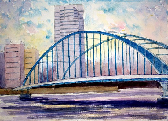 この橋はどの角度から見ても絵になる。特に正面から見るとアーチが強調され、勇壮さを感じさせる。また下からの構図も捨てがたい。この絵は、隅田川のテラスに降り立って、そこから見上げるようにして描いたものだ。
