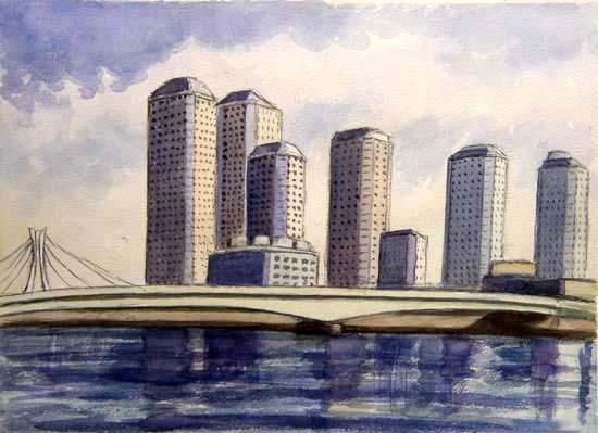 橋そのものは無愛想な表情を呈し、それ自体ではとても絵にするには耐えない。背後に林立する高層ビルとのコントラストが独特の景観を作り上げているのだ。二年程前、この高層ビル群のシルエットに魅せられて、
