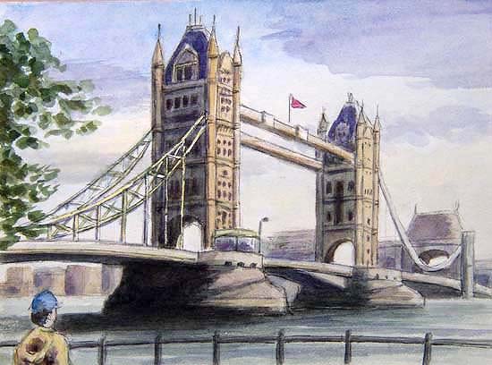 Tower Bridge…..A view from the north bank of Thames River. The bridge is the gateway to the capital. Over 900 times a year the roadway parts and lifts to let tall ships pass through. As my son, Takaki, 11 years old at the time, said to me that he got hungry, I bought some sandwiches and drinks at a cafeteria near the Tower, and ate them sitting on a bench by the riverbank with him side by side. During the lunch, I drew a sketch of Tower Bridge. |
