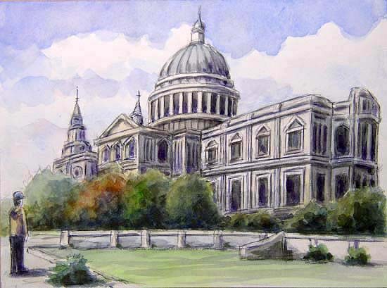St Paul’s Cathedral…The first St Paul’ s is built in 604 somewhere unknown. Old St Paul’s is built in a grand Norman style in 1087, and completed in 1310. The Great Fire of London destroys Old St Paul’s in 1666. The present building is completed in 1710 by Sir Christopher Wren. We got into St Paul's cathedral and stepped up on top of the tower. We could take a beautiful view from there, but many people gathered to make me incapable to draw the scenery. We used a public toilet near the cathedral. It was built half underground and a man was sitting in a small chamber set in a corner of the toilet. He seemed to me to be the keeper of the toilet. It was very interested. |