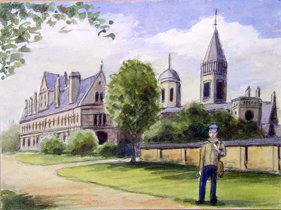 Christ Church College….There is no clear date of foundation of the University of Oxford. Balliol and Merton, the oldest colleges, were founded in the mid 13th century. Today the University consists of 26 colleges, independent and self governing. Christchurch is the biggest one It took an hour to get to Oxford from London. In 30 minutes after the train left Paddington station, a vast green field appeared around us. The field seemed to be borderless. Cows and sheep walked here and there. I guessed it might be the Green Belt. The town of Oxford was beautiful. We visited many buildings of the colleges one by one. The first was Christ Church college. It had a tall worship tower and a big ranch. I bought something for souvenir at a shop in the worship tower. |