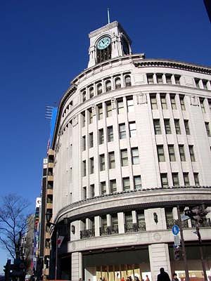 | Wako building with a clock tower on top of it, (left) has been the symbol of Ginza. The building was built by Hattori Kinzo, the founder of a clock company, later known as Seiko. The building on the right is San-Ai |