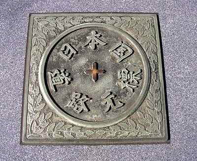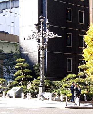 | The road origin marker set by the bridge side..(left) All distances of roads in Japan are measureed from this point. The right is the marker pole of Tokyo city authority. |