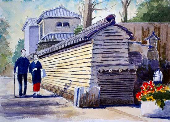 谷中寺町・観音寺築地塀:水彩画・東京風景 |