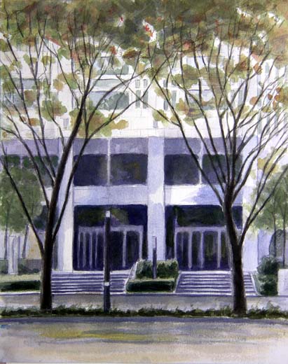 絵は都議会横手の道にある欅の並木を描いたもの。都庁周辺の欅は比較的遅くまで葉を着けておるものが多く、その色も渋みを感じさせる。十一月も末近くというのに、枝の先には渋く色づいた葉がざわめいていた。