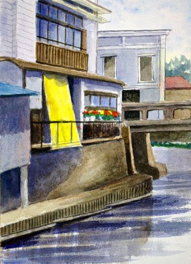 栃木・巴波川(36×26cm ヴェランアルシュ 2006年9月) 栃木市の中心部を流れる巴波川は渡良瀬川の支流である。渡良瀬川が利根川の東遷という事業によって、現在の利根川に付け替えられたのちも、関宿の上流あたりから旧川筋、すなわち現在の江戸川を通じて江戸と結ばれていた。この水利を生かして、栃木は商業都市として発展したのであった。幕末から近代にかけて、北関東有数の物産集積地としての地位を誇った。 そんなことから、栃木市内には往昔の栄華を忍ばせるような、蔵作りの建物が多く残されている。とくに、巴波川沿いには、材木問屋やら、江戸から持ち帰った物産の荷揚げのための蔵やら、物流関係の施設が多く残されている。。 この川は、今では水深が浅くなって、とても荷舟を通すに耐えるとは思われないが、昔はもっと深かったのであろう。堤を歩いていると、絵になる光景をあちこちに見かける。これも、そんな風景のひとつである。川とともに暮らす人々の息吹が伝わってくるようである。