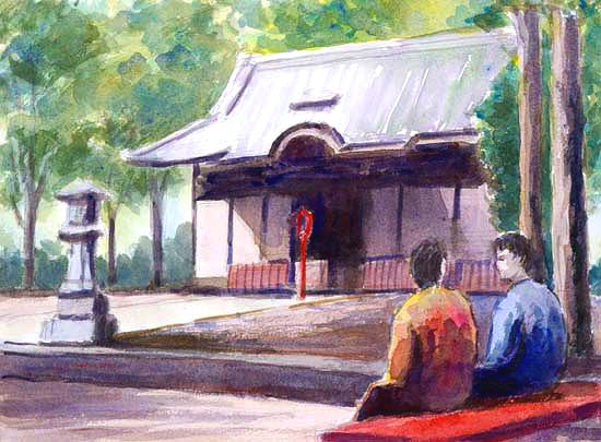 摩賀多神社(25×34cm 2005年6月) 摩賀多神社は、佐倉新町の鎮守である。佐倉は六町からなっていたが、そのうち中心の市街を新町といった。徳川時代初期、この地に城下町が形成されるのにさいし、あらたに作られた市街地をそう称したのである。新町は城に隣接する武家地と、その外周の町屋に分かたれたが、神社はちょうどその接点に位置した。 六町はそれぞれ鎮守の社を持っているが、なかでも摩賀多神社は特別の扱いを受けている。城主の堀田氏がこれをあつくもてなしたためであろう。3年に一度行われる佐倉の秋祭りは、摩賀多神社を中心に各町が合同で行う祭である。各町の山車がおそろいで目抜き通りを練り歩くほか、摩賀多神社の神輿が渡御する。 地元の人々は節目ごとにこの神社にお参りする。わたくしも少年時代には毎年この神社に初詣をしたものであるし、子どもができてからは、世の親の例に倣い、七五三のお祝いをこの神社で催したものである。 関連リンク: 佐倉の祭