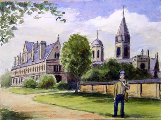 絵にしたのはクライストチャーチ、もっとも規模の大きいカレッジだそうだ。そのとおり、キャンパスの背後に広大な草地が広がっていた。見物者を気楽に受け入れるので、観光客の姿も多い。建物の中に土産物屋を出させているほどだ。わたくしはそこで友人たちのためにボールペンを買い求めたのだが、それがなぜかパーカーの製品であったことに、一種釈然としない気分を覚えたものである。