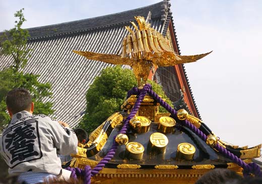 | 浅草の三社祭は、東京の祭の中でも、粋で威勢のいいことで もっとも名の通った祭です お祭の当事者のみならず、見物する人々を巻き込んだ喧騒ぶりは 江戸時代以来連綿と続く東京の祭の中の華ともいうべきものでしょう 氏子区域は浅草地域の北半分、決して広くはありませんが 下町の雰囲気が色濃く残る地域で 浅草寺を中心に、街のアイデンティティが強いところです 三社の名の由来は浅草寺創建の歴史にさかのぼります 今から1300年以上も前、この地の猟師が隅田川で漁をしていたところ 水中から観音像を釣りあげました ありがたい像だというので 大切にしてお堂に祭りました これが浅草寺の創建の縁起ですが 観音像を吊り上げた猟師の兄弟と、像を鑑定した土地の老人をも 併せて神社に祭ることとしました これが三体の神を祭る浅草神社の由来です 徳川時代までは、浅草寺と浅草神社は一体のものとして 祭礼も共通していましたが 明治以降両者が分離したことにともない 三社祭は浅草神社の例大祭として行われるようになりました 三社祭は毎年5月の下旬に催され 東京の初夏を代表する風物詩になっています 100体もの神輿が域内を練りまわり ソイヤ ソイヤの掛け声が天地に充満します |