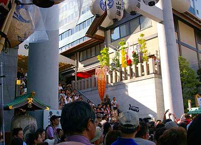 大神宮の鳥居前には大勢の群集が詰め掛けて 身動きもできないほどです 社前の石段には 早くから陣取ったひとびとが つぎつぎと 御輿の敬礼を受けていました こんな形のご利厄もあるようです |