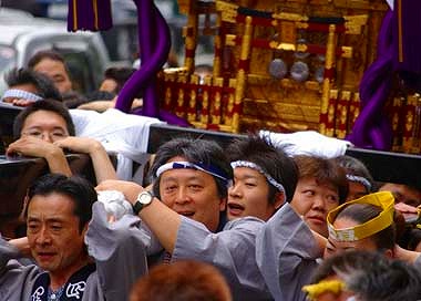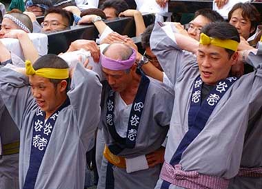 この祭りの神輿の担ぎ方には特徴があります 先頭にいる担ぎ手たちは 天棒の先端に首をあて 両手を後ろにまわして 足を踏ん張り 神輿があまり早く動かないよう制御しているようにみえるのです |