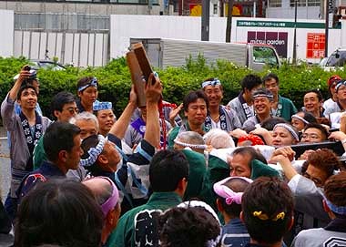 神輿をいったん台座へおろすことなく 担いだままの姿勢で交替します