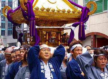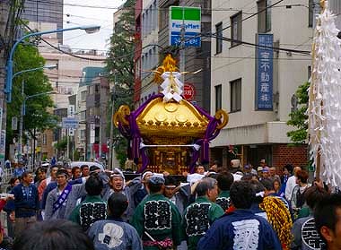神輿の一団は三栄町通りから 再び新宿通りへ出てきました