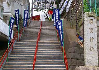 須賀神社は新宿通りを南側に入った下り坂の先にあります