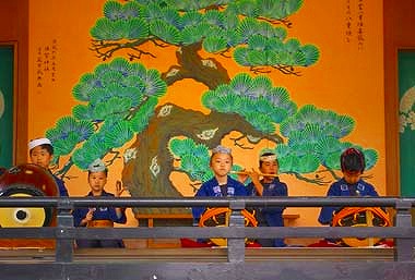 境内の神楽殿で祭囃子を演奏する子どもたち