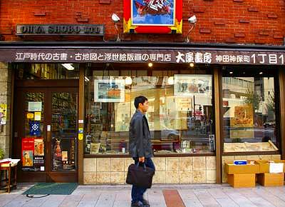 ![]() 古書店街としての神田神保町の歴史は明治の半ば以降のことです 徳川時代 この一帯は旗本の屋敷地でしたが 維新後は新政府の高級官僚が移り住み また 私立学校が周辺部に多く進出してくるのに伴い それらを相手にした書籍商が集まり始めたのがきっかけです 大正の初期 九段と須田町を結ぶ靖国通りが出来たのを契機に 通りの南側に多くの古書商が店を構えるようになり 今日の神田古書店街の原型が出来上がりました 関東大震災ではほぼ全焼したとされますが 対戦中の空襲を免れ つい最近まで戦前の街並の雰囲気を色濃く残す地域でした 神田神保町一帯には 現在 130余りの古書店 30余りの新刊書店 また30余りの取次店が立ち並び 世界最大規模の書店街を形成しています ![]() 靖国通りの南側に連なる書店群 店が通りの南側を選んだのは もちろん 日の光から書物を守るためです ![]() 古書店には様々なジャンルのものを幅広く扱うもののほか 特定の分野に特化したものもあります 大屋書店は明治15年創業という老舗で 江戸時代の古書や古地図を扱っています ![]() 八木書店は文芸書が中心です ![]() 弘文堂は人文科学 一誠堂は古書籍に見るべきものがあり 神田でも有数の老舗です ![]() 田村書店は文芸書が中心で フランス語の本を多くそろえています ![]() 店の前に設けた棚の中には 文庫や新書などの安価本を置いています ![]() 通り沿いに残る戦前の建物 ![]() これは 一棟の建物を 二軒の店が半分づつ分かち合っています ![]() ![]() 左は巖正堂 右は神田古書センター ![]() 演芸関係に特化した古本屋もあります ![]() 北沢書店は洋書専門店 ここでは 店頭にない本でも取り寄せてくれます 秋葉原 | 須田町 | 神田駅周辺 | 神保町 | すずらん通り |