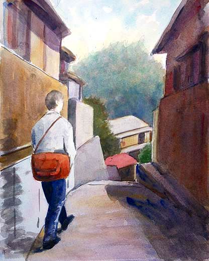 わたくしは宮小路にあった家から歩いてこの学校に通った。少年の早足で20分くらいの道のりだったろう。卒業して以来わたくしは高校時代のことなどすっかり忘れてしまい、自分がどんな道筋をたどって通学したのかも思い出せなかったが、ある時袋町にある寺に墓参りをした帰りに、弥勒町辺で絵にあるような坂道を見出して、これがあの佐倉高校へ通う道であったことを突然思い出したのであった。これまで何度も通りかかりながら気にもならなかった道が、何故かくも訴えかけてきたか、その時のわたくしは不思議な感に打たれたものである。