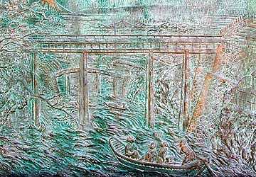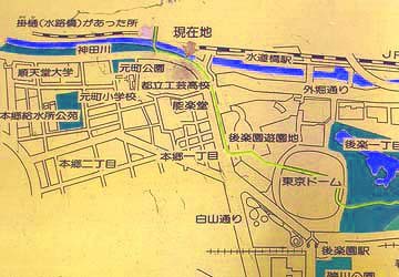 水道橋が始めて架けられた年代は詳しくわかっていませんが、17世紀の中頃かそれ以前のことと思われます。当初は吉祥寺橋と呼ばれていたとする記録があります。吉祥寺は橋の付近にあった寺で、明暦の大火後現在の駒込に移転しています。 水道橋の名の由来となったのは、神田上水の懸樋でした。これは現在の水道橋より100メートルほど下流の地点で神田川を跨いでいました。そのためこの一帯を水道橋と称するようになり、それが現在の水道橋にも用いられるようになったと思われます。 先代の水道橋は震災復興橋梁のひとつとして、昭和3年(1928)に架けられています。下流にある他の震災復興橋梁と同じくアーチ型の橋でした。 現在の橋は白山通りの拡幅のため、昭和63年(1988)に架けられたものです。先代の意匠の思想は受け継がれず、機能一点張りの味気ない橋になってしまいました。 水道橋近くにある懸樋のモチーフ(下から2枚目) 水道橋付近の神田上水の流れ図(最下段)上水道は後楽園内を通り、水道橋の下流で懸樋となって神田川を跨いでいました。作られたのは、家光の時代、1629年とされています。 |