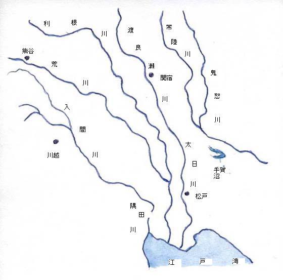 ![]() 上図は、家康が江戸に入府する天正18年(1590年)より以前の時代における、主要な河川の流域を示したものです。 一番東側を流れる太日(ふとゐ)川は、渡良瀬川の最下流にあたっています。現在の渡良瀬川は利根川の一支流ですが、当時は独立した河川として江戸湾に直接流入していたのです。 利根川は、いま古利根川として残っている川筋をたどって、ほぼ現在の旧中川の流れに沿って江戸湾に流入していました。 荒川は、昔から暴れ川として恐れられ、洪水のたびに流路を変えたと思われますが、途中で利根川に合流していました。つまり基本的には利根川の支流だったわけです。 隅田川は、入間川の最下流にあたっていました。現在の隅田川は荒川の支流扱いですが、昔は入間川筋として独立した河川だったのです。 |
