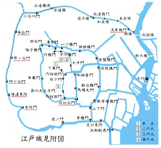 ![]() (人文社刊「江戸切絵図で歩く」から引用) 寛永13(1636)年に完成した江戸城は、神田川から汐留川に及ぶ最外周に外堀を配し、その中にいく重もの内堀と運河を巡らせていました。いわば水に囲まれた城郭都市だったのです。 各々の堀には城内に入るための橋が架けられ、橋の内部には枡形門が設けられました。枡形門は、敵の侵入を想定した防衛のための砦でありましたので、この頃の江戸城はまだ戦略上の考慮に基づいて築城されたことがわかります。 地図には両国橋以下の隅田川の橋も記載されていますが、江戸城完成の頃にはそれらの橋はいまだ架けられておらず、城全体が外部からの浸入に対して厳重に防護されていたのでした。 主な門について、見てみることにしましょう。 浅草橋御門 奥州道中の起点となる門で、戦略上高い位置づけを与えられていました。明暦の大火の際には、この門が閉じられたため、大勢の人が逃げ場を失い焼け死にました。 喰違橋門 明治の初期、この門の石を使って万世橋が作られました。 四谷門 甲州道の起点となった門です。 芝口見附 東海道の起点となった門です 大手門 江戸城の正門ともいうべきもので、多くの大名はこの門をくぐって本丸に拝殿しました。 一ツ橋門、清水門、田安門 徳川三卿の一橋、清水、田安の各屋敷があったところです。家の名はそれぞれ門の名からとられたといいます。 |