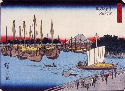 広重「東都永代橋佃島」 手前が永代橋。 その先に帆柱が林立する光景は永代橋の風流とされた。 諸国の回船はこのあたりに停泊し、荷物を艀に積み替えて 日本橋に運んだのであろう。 広重「永代橋佃しま」 永代橋の橋脚の下から佃島方面を望んだものか。 左手に見えるかがり火は 白魚漁の光景 背景には やはり廻船の帆柱が描かれている 東京を描く>東京の川と橋>浮世絵TOP