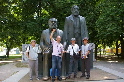 ![]() (ベルリンにて浦子が用意せる朝食) 六月二十日(火)晴れて溽暑甚だし。六時頃起床するに夜すでに白みたり。昨夜は十一時頃まで薄暮の如くなれば、ベルリンの夏の夜の短きを知るべし。七時頃、浦子の手づから作りし朝食をふるまはる。材料は昨夜のうちに近くのスーパーにて買ひおきしものなり。ドイツパンに生ハムと果物の組み合はせなり。牛乳を飲みつつ食せり。食後の後片付けは余と岩子これを担当す。 ![]() 八時半頃アパルトメントを出で、歩みてローザ・ルクセンブルグ広場に至る。道路上にローザの言葉を刻してあり。いはく社会民主党員は腰抜けなりと。第一次世界戦線前後の彼女の活動を象徴する言葉なり。その言葉のとほり闘争的なる生涯を送り、官憲によって虐殺せられしはよく知られたる史実なり。 ![]() ローザ・ルクセンブルグ・プラッツ駅より地下鉄に乗りアレクサンダー・プラッツに至る。この広場はベルリン最大の繁華街を控へてあり。テレビ塔、世界時計、ベルリン市ラートハウスなど重要建築物集中す。世界時計は東ドイツ時代に建造せられ、いまだにベルリンのシンボルとして、世界諸都市の時刻を表示しをるなり。 ![]() 広場の一角に小森林あり。その傍らにマルクス・エンゲルスの銅像立ちたり。その銅像の前にて余ら四人並びて記念撮影をなす。アメリカ娘にシャッターを切らしめたるなり。東ドイツ時代の遺物のうち、ソ連の息のかかりたるものは撤去せられたれど、マルクス・エンゲルスは生粋のドイツ人たる故を以ていまだにドイツ市民に親しまれをるやうなり。 ![]() シュプレー川にかかる橋を渡り、いはゆる博物館島に至る。シュプレー川の中州に、大聖堂のほか多くの博物館の建ち並びたるところよりこの名を得るといふ。大聖堂はプロシャ国王ホーエンツォレルン家の菩提寺にて、歴代の皇帝の墓を安置すといふ。 ![]() ペルガモン博物館を見物す。中東の古代文明の遺産を展示するところにて、圧巻は古代都市ペルガモンの遺跡を復元したる構築物なり。この博物館は、ルーブル美術館及び大英博物館と並び、人類の遺産を多く所蔵する由なり。そのため見物客多く押し寄せ、入館規制をなしおるほどなり。余らは開館前に到着したれば速やかに入館すること得たれど、後から来れる者は長い列に並ばされてあり。 ペルガモン博物島に接してドイツ歴史博物館あり。ここは名の如くドイツの歴史的遺産を展示する由。目下大規模なる国家行事の準備中にて、中庭には管弦楽団演奏の練習に余念なし。これらを含め、この界隈の歴史的建築物には、ギリシャ風の列柱を正面に据ゑたるもの多し。ギリシャ風の擬古趣味はドイツ人特有の傾向といふべし。 歴史博物館の近くには、フンボルト大学の建物群建ち並びたり。この大学は十九世紀初頭に創建せられ、ベルリン大学としてフィヒテやヘーゲルと結びつきをれど、日本にては帝国大学の模範として知られをる由なり。構内の一隅に、ナチスによる焚書事件を記念する構築物あり。焚書の舞台となりし場所に、ナチスによる蛮行を象徴する結構を構築しをるなり。すなはち路上に大いなる穴をうがち、その内部に空虚となりし書棚を並べ、上部をガラスもてふさぎ、そのガラスを通じて穴の内部を見しむるといふ工夫なり。 ![]() フンボルト大学より南の方向へ歩き、ややしてジェンダルメン・マルクトに至る。ベルリン市内最も優美なる場所として知らるるところなり。その名はフランス語のジャン・ダルム(Gens d'Armes)に由来する由。コンツェルト・ハウスの荘厳なる建物を囲み、フランス・ドームとドイツ・ドーム相向かひて立ちたり。また、広場中央にシラーの銅像を配置せり。二つのドームはどちらもロマネスク様式の建築物なり。その外観双生児の如く相似たり。ドームとはいへど、いまは教会の機能を有せず、歴史的建築物として内部を公開する由なり。尖塔の先端まで登ることを得るといふなれど、足腰に自信を持たざれば上ることをせずしてやむ。 広場の一角にイタリア料理店あり。その店の野外席に腰掛けて、二つのドームを交互に眺めあげつつパスタ料理を食ふ。生ビールことのほかうまかりき。 |