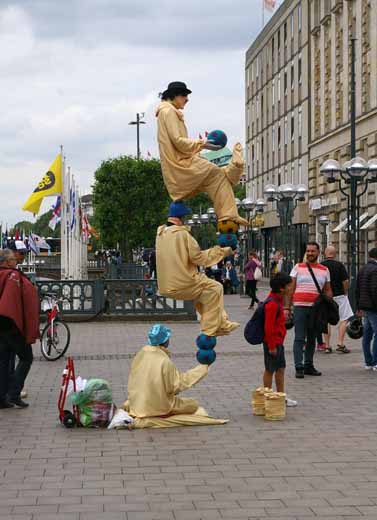 ![]() (ハンブルグ市役所<ラートハウス>) 食後歩みてバウムヴァルに至り、そこより地下鉄に乗りラートハウス駅に至り、ハンブルグ市役所(ラートハウス)を訪問す。ゴチック風の壮大なる建物なり。この壮大さはハンブルグの富を象徴しをるが如し。ハンブルグは中世以来ハンザ同盟都市として栄え、巨万の富を蓄積す。今日においてもその富を背景にして、国法上ラント(州)と同格のステータスを誇るなり。 ドイツにて、ラントの権限は強大なり。アメリカのステート同様、内政にかかはるほぼすべての政治的・法的権限を行使す。しかれば、ハンブルグは一都市にして国家に劣らぬ存在感を発揮しをるなり。ラートハウスは、そのハンブルグの象徴として、単に市役所といふのみならず、一国家行政機関にも比せらるるなり。 ![]() ラートハウス前は市民広場なり。その一角にドイツ娘たちの一団あり、なにやらパフォーマンスをなしをれり。近づきみるに、水兵帽の如きものをかぶり、セーラー服の衿をつけたる少女数名、リーダーの音頭に合はせて歌を歌ひだしぬ。歌詞の如何を知らざれど、ハンブルグを賛美しをるものの如し。 ![]() 正門扉をくぐれば左右に光まばゆきゴシック風装飾を施されたるエントランス空間広がり、そこを横切れば内庭に通づるなり。内庭の中心には青銅の彫刻群置かれてあり。その彫刻を眺めつつ休みをりしところ、岩子俄に便意を催す。便所を探すになかなか見つからず。緊急事態とて谷子に助けを求めたれば、谷子岩子を携へて便所の在処を探索す。やうやく見付けることを得たりといふ。例により便所の利用料として些かの金を要求せらる。それも二人の者に要求せらるといふ。妙とは思ひたれど、切羽詰りをれば反省の余地なし。二人分の料金を与ふるや、脱兎の如く個室に入り、たちまち便器に座して用を足せりといふ。余おもへらく、岩子は大金を投じてラッパを鳴らせるなりと。 ![]() ラートハウスはアルスター湖にほぼ接して立ちたり。両者を結ぶ舗道を歩むに、ハーレクィンの如き扮装の者らパフォーマンスをなしをれり。人を三重に重ぬるなり。一番下の人右手にて男を支へ、その男同じく右手にて第三の男を支ふるなり。もっとも第三の男は実物にはあらず、人形なり。それにしても、片手一本にて大の男を支ふるとは驚きに耐へたり。 ![]() アルスター湖畔を散策す。アルスター湖は、谷子によれば、エルベ川の支流アルスター川を堰きとめたる人造湖の由。アウセンアルスター及びビンネンアルスター大小二つの湖よりなり、この両者を隔つる堤に鉄道を通してあり。余ら、ビンネンアルスターのほとりに憩ひて、茶を喫す。浦子日本語の発音もてミルクティーを注文せしところ、湯を入れたる茶碗にインスタント・ティーバッグを添へて供せらる。ミルクはあらず。余浦子に向かって教示す、ドイツにて本物のミルクティーを欲しなば、テ・ミット・ミルヒと言ふべきなりと。 茶を喫しつつアルスターの湖面を眺めをるに、ハンブルグゆかりの詩人ハイネがハンブルグを称へて詠みし詩の一節思ひ出でられたり。曰く ハムブルグで私は人に訊ねた この町の街路はどうしてかう臭いんだね しかし猶太人と基督者はかういって答へた それは掘割のせゐだよ (「ハイネ新詩集」より、番匠谷英一訳) この歌を思ひ出でつつ、ハイネが何ゆえにアルスターの美しさを称へずに、掘割の臭気を嘆いたか、腑に落ちぬ心地せり。 ハイネは続けてアルトナをも歌ふなり。曰く、 ハムブルグの次にアルトナの町を見物したが これまたずゐぶん美しいところだった そこでどんなできごとにぶつかったかは このつぎに話すことにしよう 余らがアルトナにて見聞したることは先述のとほりなり。 湖上オオハクチョウ、コハクチョウのほか、雁も多く棲息す。ドイツの雁は日本のそれよりも一回り大なり。みな人間に馴れ、近づき来りては餌をねだるなり。 アルスター湖よりハウプトバーンに至る道は、ハンブルグ最大のショッピングモールなり。一軒の時計屋に立ちより、時計を物色す。浦子は細君のためにユングハンスなる腕時計を求む。他のもの冷やかしていはく、これにて細君を喜ばしむれば、重ねて海外旅行の許可を得るべしと。 ![]() ハンブルグのハウプトバーンホフも開放型駅舎なり。ここより地下鉄に乗りダムトーアに至る。しかして六時丁度にホテルに戻り、暫時休養す。 |